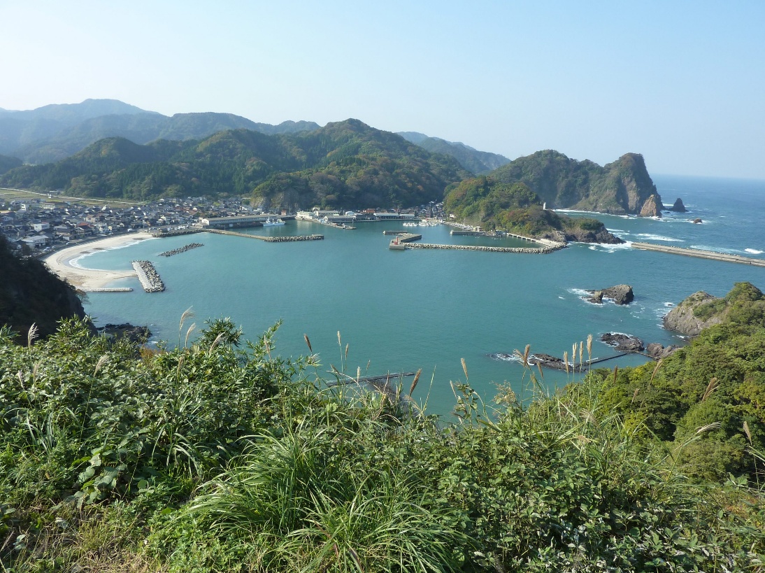 山陰海岸の特徴であるリアス式海岸の入り組んだ地形は、北前船の風待ち港(避難港)として活用されました。諸寄港もそのひとつです。狭い入り口から内部に広がる天然の良港で、その巾着型の地形が風待ち港に適していました。現在でも各地の入り江には北前船の保留跡が見られます。