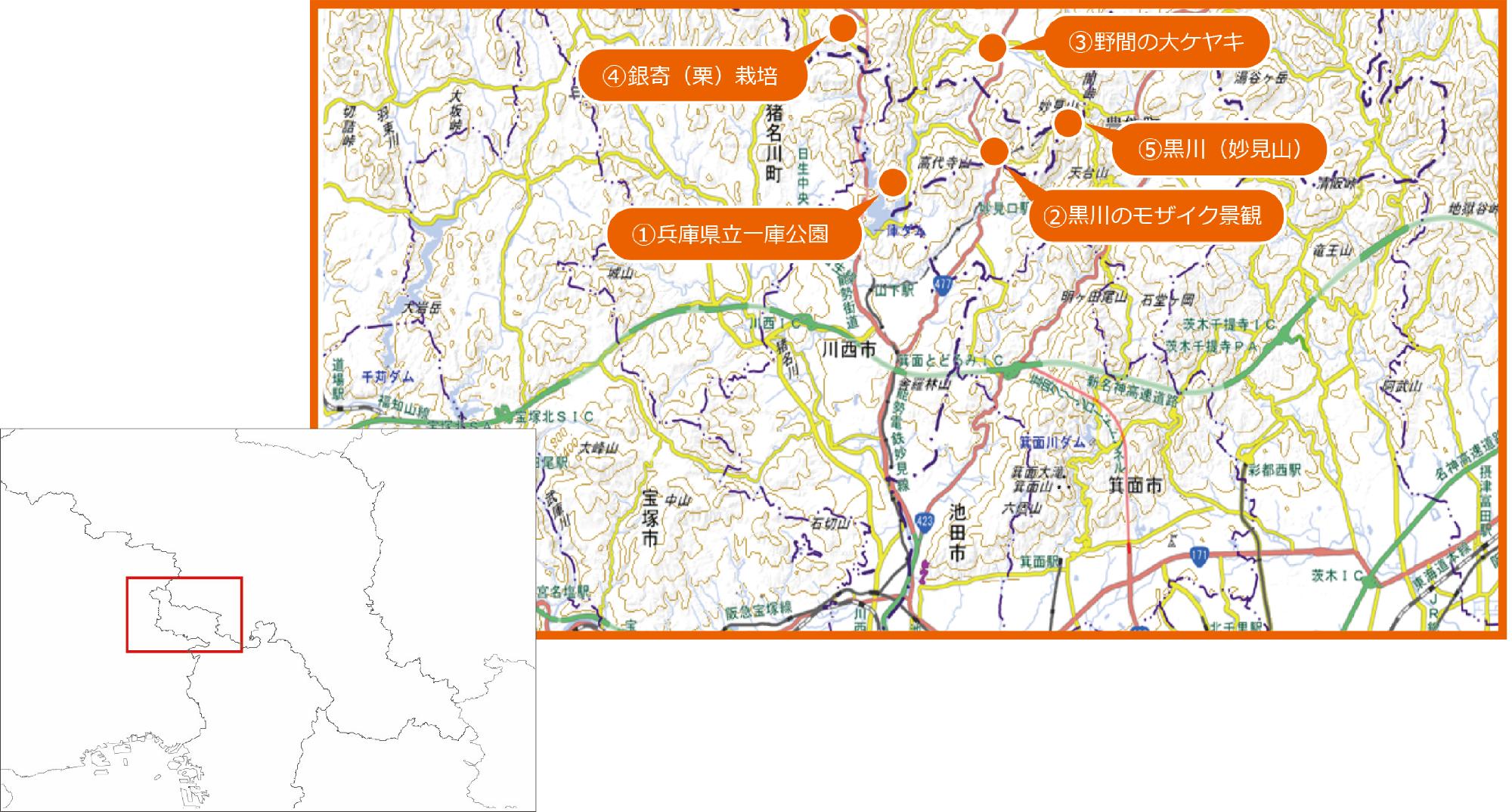 市の最北部に位置する黒川地区周辺は、里山林、社寺林、田畑、草地などの多様な風景が広がり、「日本一の里山」とも称される地域です。菊炭生産の伝統が現在も受け継がれ、県のレッドデータブックで貴重な植物群落に指定されるエドヒガン(サクラ)の群落がみられます。